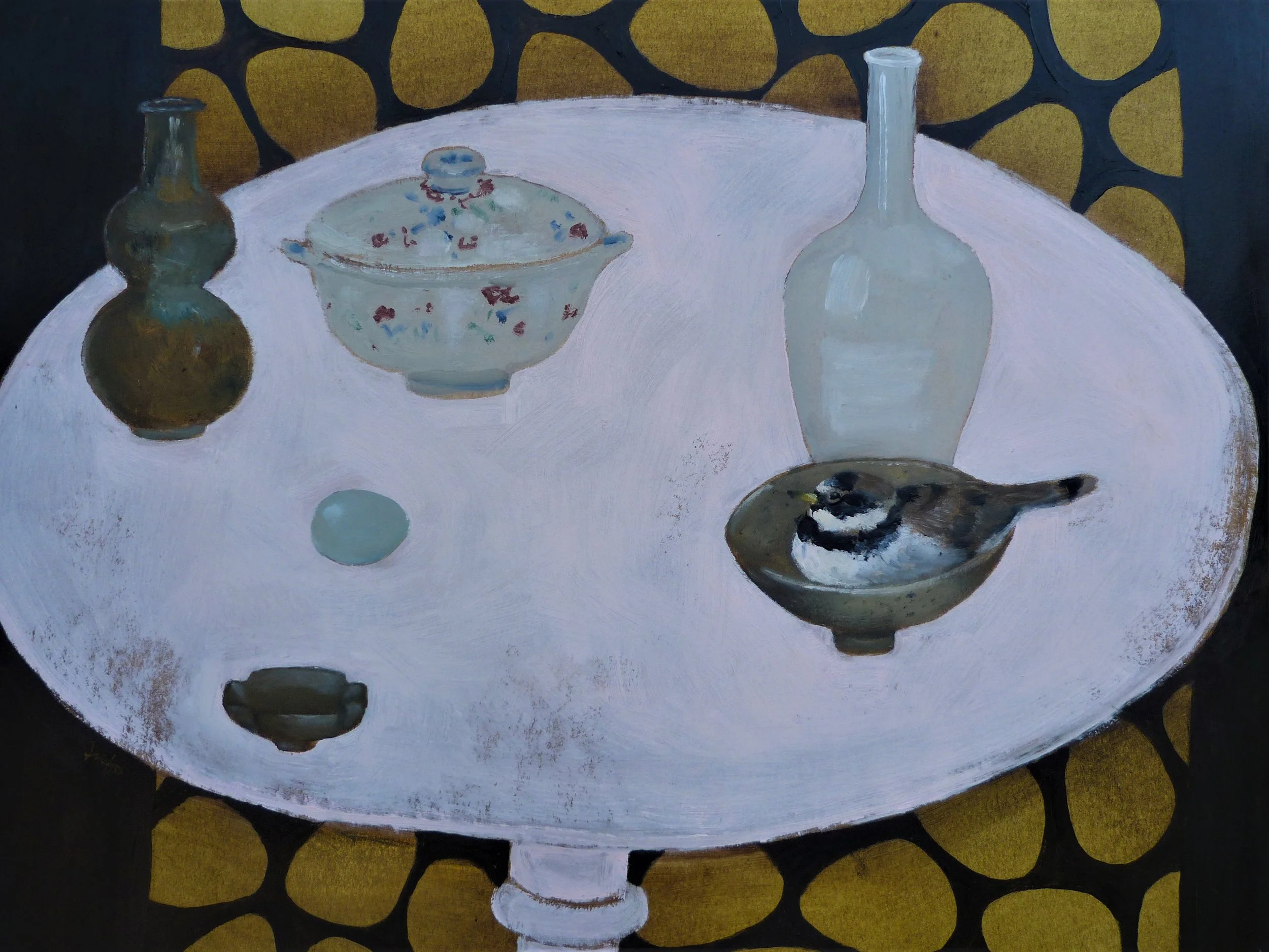 Fiona's paintings are table top still lifes, featuring objects from her domestic surroundings. Her work is influenced by flat winter island landscapes, both in colour and composition, such as greys of the sea and the wet sand, and brown of wet earth.